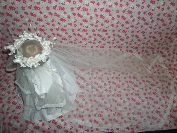 Je suis La Mariée de 1992 et 1993. J'appartiens à La Symphonie en Blanc ou la Nostalgie du Passé et des Petites Filles Modèles. Mon corps est souple avec la tête et les bras articulés sur buste vinyle. Mes jambes restent naturellement pliées. J'ai un teint de porcelaine. Je porte une perruque coiffée en chignon. Mes yeux de verre sont fixes avec des longs cils mais qu'en haut ! Une des exceptions parmi les yeux de verre aux long cils. Je suis en tenue d'origine complète. Je suis signée Catherine Refabert.